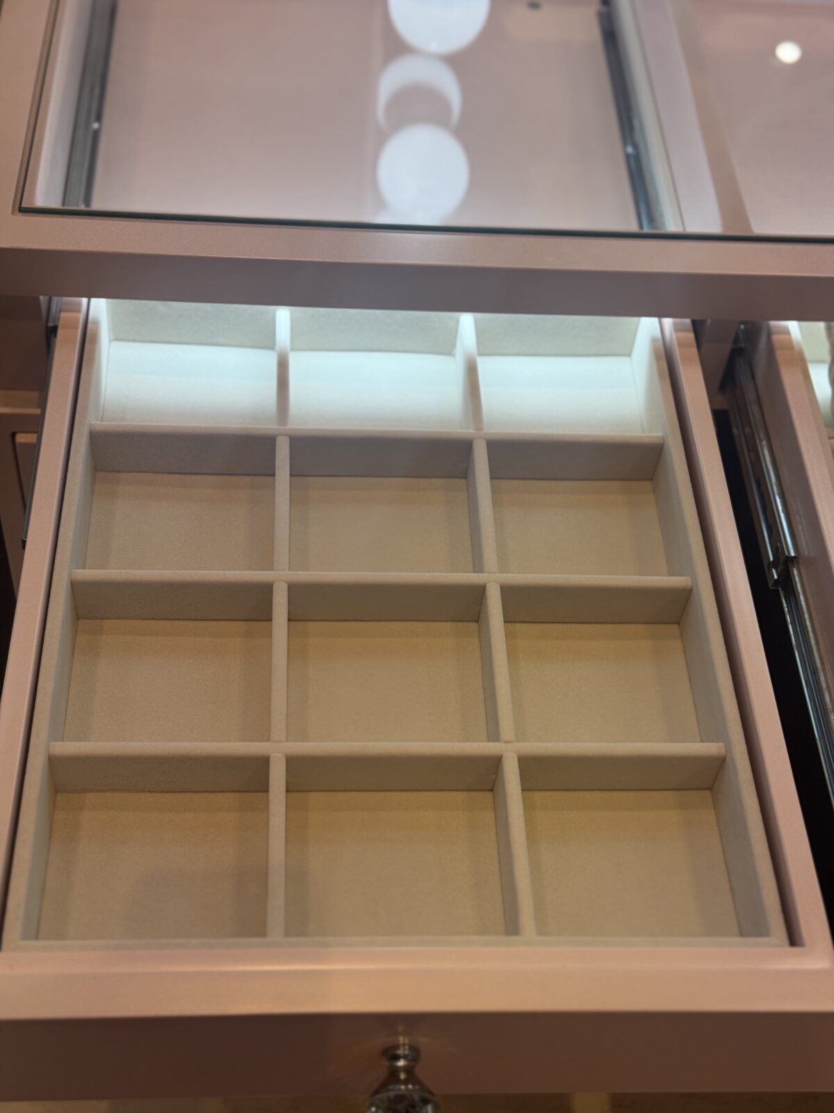 Chaque plateau a été pensé pour épouser parfaitement les dimensions intérieures des tiroirs de la coiffeuse Diamond, offrant un rangement aussi ordonné que luxueux
