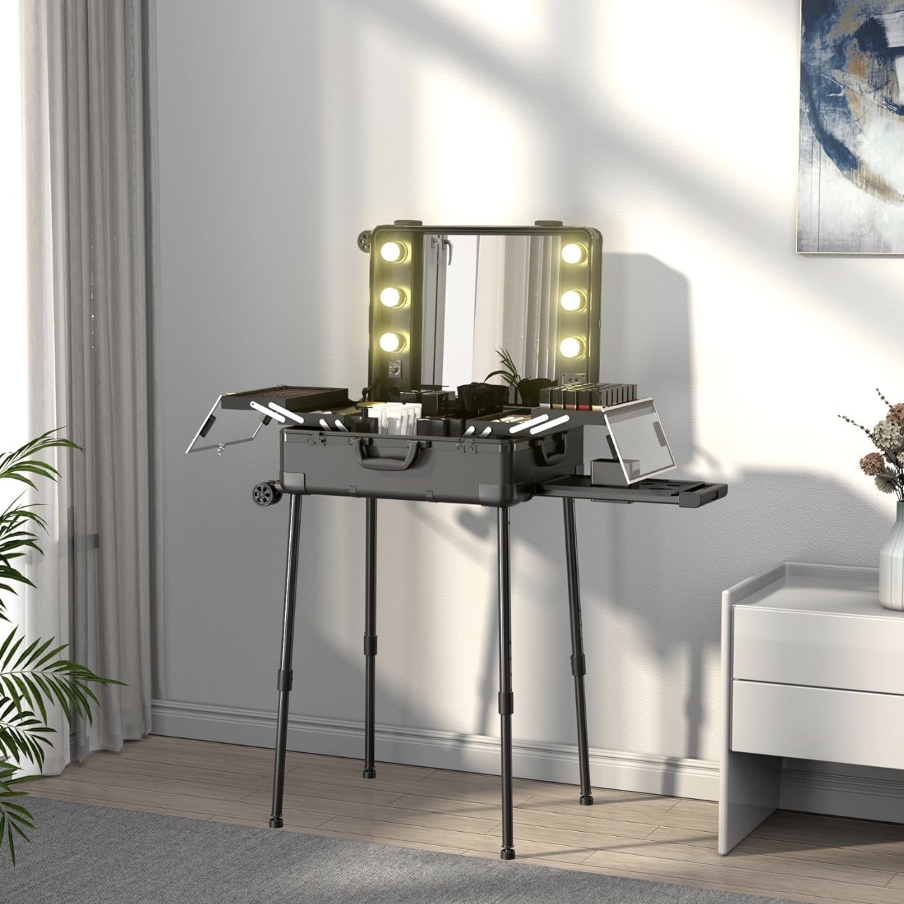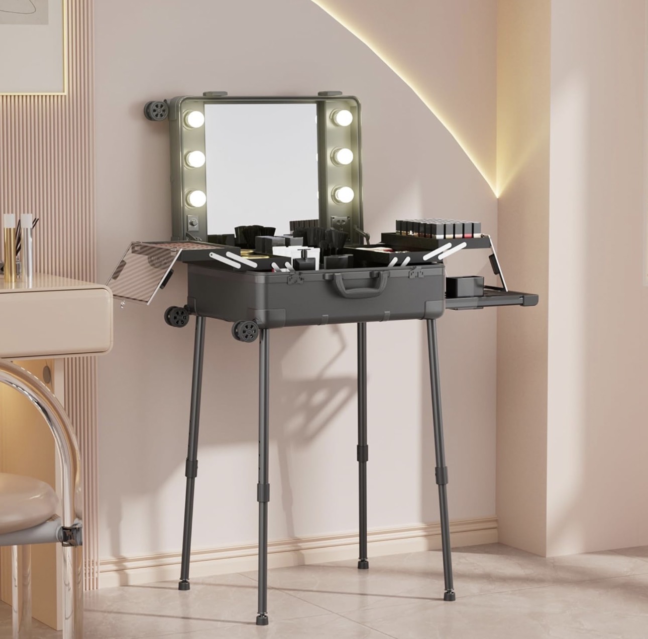 Grâce à son miroir lumineux intégré, ses espaces de rangement modulables et ses pieds réglables, elle offre un confort de travail optimal, aussi bien à domicile qu’en déplacement.